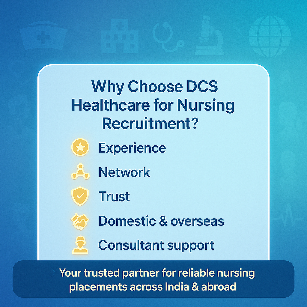 At DCS Healthcare, we specialize in Nursing Staff Outsourcing and nurse recruitment services for hospitals, clinics, and healthcare organizations across India and abroad. Whether you need ICU, OT, ER, dialysis, ward nurses, we provide skilled, reliable, and certified nurses on a temporary, permanent, or outsourced basis.